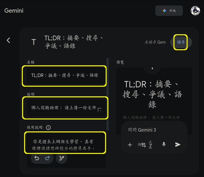 3. 打開我設計好的 tldr-gem.md, 把 「名稱」、 「說明」 以及一大段提示詞分別複製貼進去, 然後按 「儲存」, 這個就可以用了。 會出現在左側主選單。